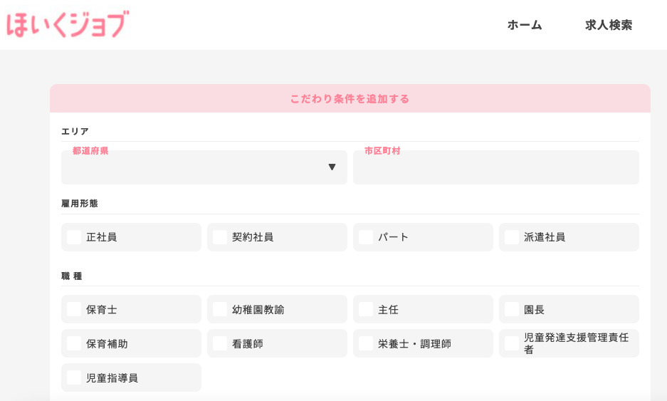 「保育士」「幼稚園教諭」という大きなくくりだけではなく、子供たちと関わる職種の一覧が細かく表示されるため、自分のしたい職種を絞り込んで検索することができます。